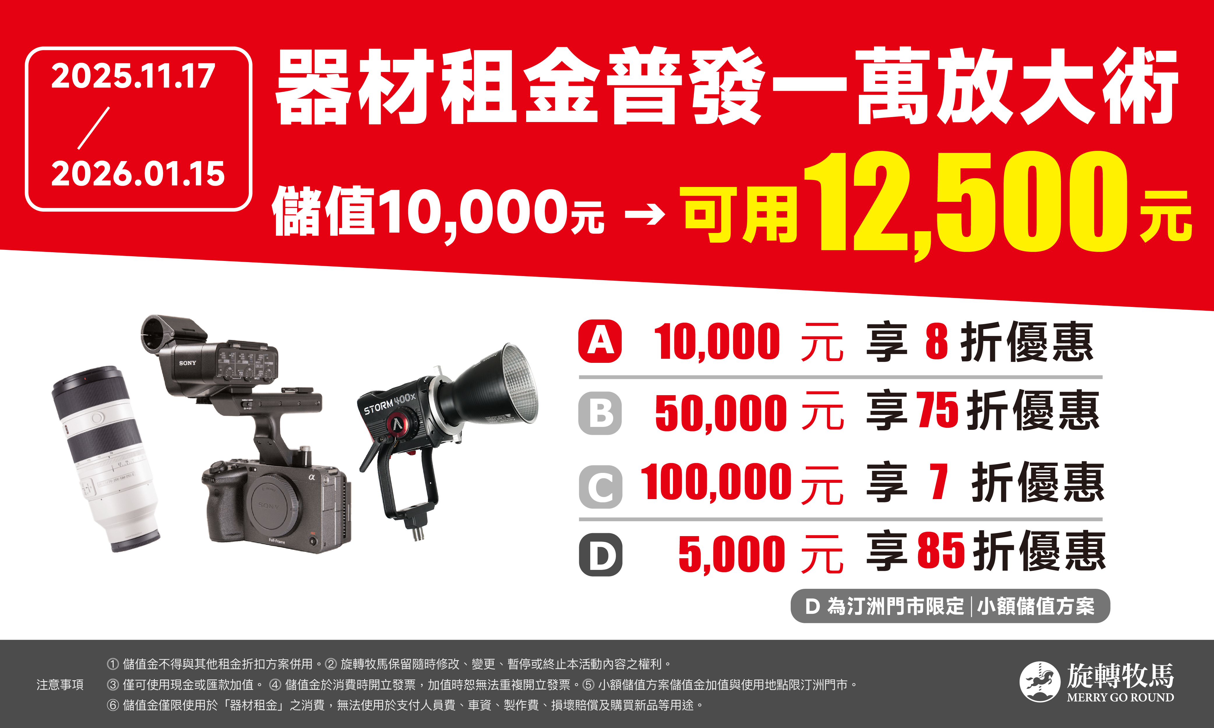 只要在活動期間內儲值指定金額,就能立即放大你的攝影預算,無論是商案拍攝、畢製拍片、YouTube、自媒體創作,都能以更划算的方式租到專業器材。
