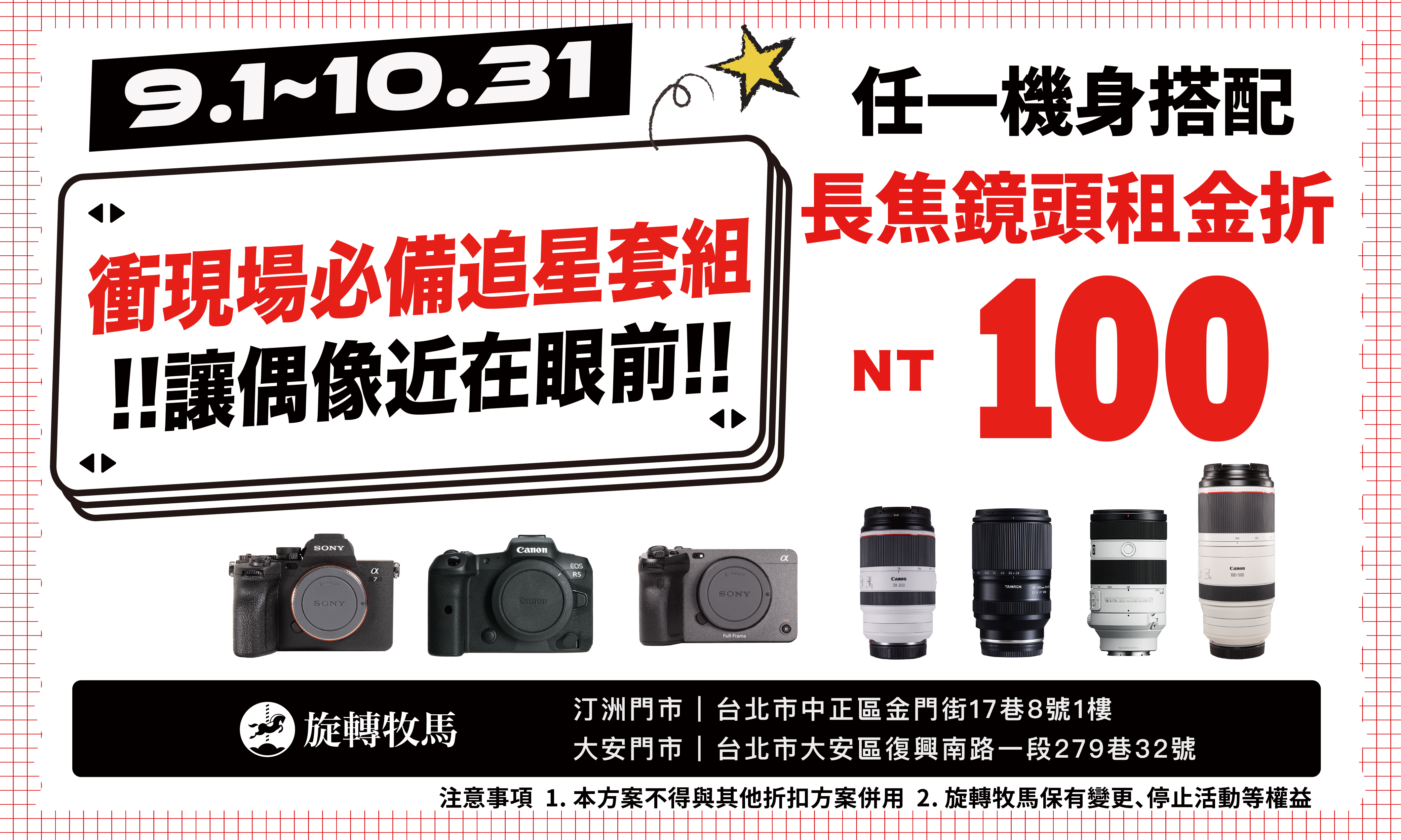 只要任意相機機身搭配一顆長焦鏡頭租金現折 100 元。